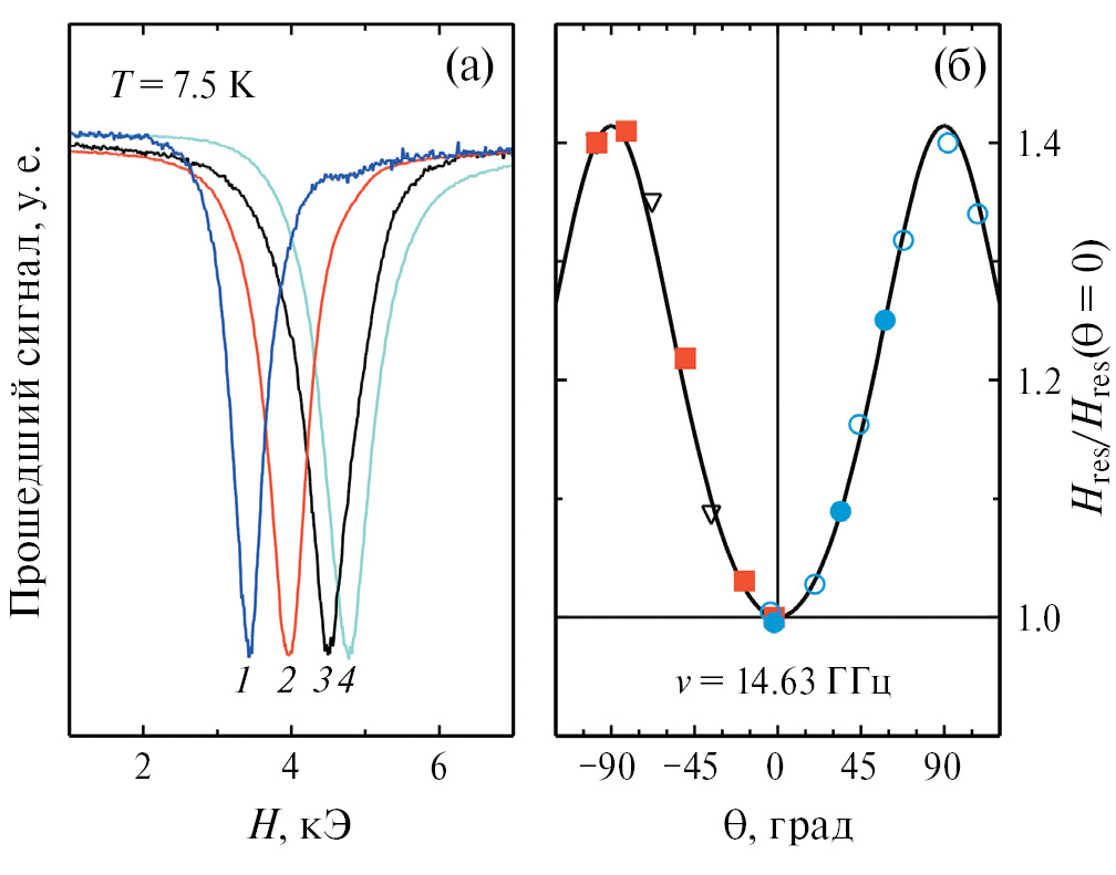 Полученные при трех разных температурах угловые зависимости резонансного поля Hres(θ), нормированные на соответствующие значения Hres(θ = 0), показаны на рис. 4б разными символами. Как видно, все три экспериментальные угловые зависимости одновременно описываются выражением (2) с φ = 45° (сплошная линия на рис. 4б). Следует отметить, что при обратном вращении резонансные линии оказываются слегка смещенными вправо, что свидетельствует о наличии небольшого люфта в системе передаточных шестерен. Соответствующие точки, обозначенные закрытыми символами, смещены на рис. 4б по углу вправо на 2°.
