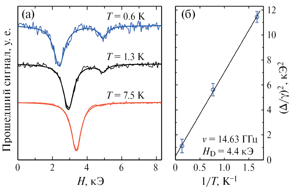 Для микроволновых измерений в диапазоне частот 9–21 ГГц использовался изготовленный в лаборатории СВЧ-спектрометр проходного типа с прямоугольным резонатором. Амплитудно-модулированный микроволновый сигнал от клистронного СВЧ-генератора Г4–111 передавался по коаксиальному волноводу к резонатору с образцом. Прошедший через резонатор сигнал поступал по выходному волноводу на полупроводниковый детектор и затем измерялся с помощью фазочувствительного усилителя lock-in SR830. Записи сигнала проводились при трех различных температурах на постоянной частоте одной из собственных мод резонатора типа TE01N при прямой и обратной развертке магнитного поля.
