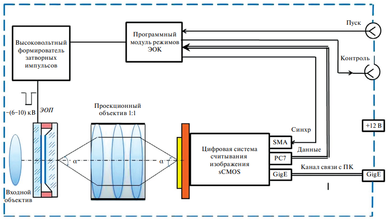 Изображение исследуемого быстропротекающего процесса фокусируется на фотокатоде ЭОП. Наша камера имела фотокатод типа S20, но возможна и версия камеры с солнечно-слепым фотокатодом. При поступлении на вход ЭОК сигнала запуска в соответствии с установленными параметрами задержки и длительности экспозиции высоковольтный формирователь затворных импульсов подает на фотокатод импульс с амплитудой 6–9 кВ, который открывает его на установленное время в диапазоне от 60 нс до 1200 мкс.