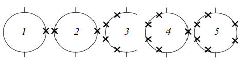 Рис. 4. Ячейки в виде ВЧ-СКВИДа (1), ПТ-СКВИДа (2), кинетической индуктивности из четырех ДП (3), SNAIL-структуры в виде СКВИДа с петлей из кинетической индуктивности четырех больших ДП и одним малым нелинейным ДП (4), то же с двумя малыми ДП (5).
