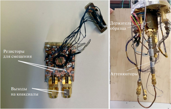 Снятие спектров пропускания чипа проводится с помощью отечественного векторного анализатора цепей Arinst VNA-PR1. В качестве генератора накачки использован НР8684В. Сигнал по коаксиальным кабелям идет внутрь криостата, он смешивается с волной накачки через тройник; далее волны попадают через холодный аттенюатор с суммарным ослаблением 60 дБ в чип усилителя; после прохождения волнами цепочки ячеек усилителя результат их взаимодействия попадает в вентиль и затем в холодный полупроводниковый усилитель (с усилением 25 дБ в диапазоне частот 2–6 ГГц); после выхода из холодной части сигнал попадает в теплый усилитель (с усилением 20 дБ до 6 ГГц) и возвращается в анализатор цепей. Чип также подключен через резисторы (по 10 кОм с каждой стороны) к разъему смещения и усиления на постоянном токе – это позволяет задавать смещение по постоянному току и снимать ВАХ-цепочки. На холодной пятке установки расположен также угольный термометр для измерения фактической температуры держателя образцов.