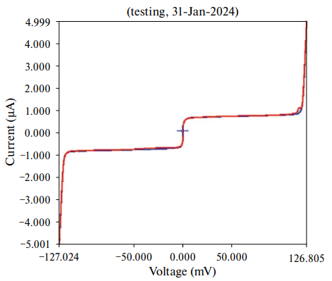 Рис. 9. Вольт-амперная характеристика короткой цепочки 50 ячеек SNAIL, расчетная суммарная щель 2.8 ∙ 4 ∙ 100 = 112 мВ, измеренный критический ток 1 мкА.