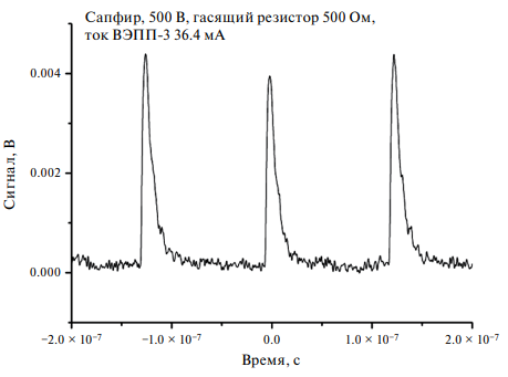 Рис. 12. Сигнал от вспышек СИ с сенсора из лейкосапфира с гасящим резистором 500 Ом. Напряжение на сенсоре 500 В, ток в меньшем сгустке 29.3 мА.
