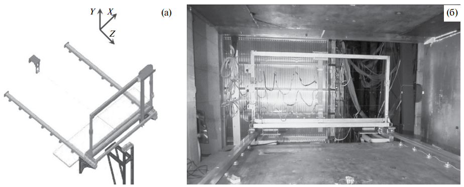 Рис. 2. Слева: схематический вид тележки с кассетой и датчиками Холла на рельсах. Справа: фото системы магнитных измерений внутри спектрометрического магнита СПАСЧАРМ. В принятой и показанной здесь правой декартовой системе координат ось Z направлена вниз по пучку, ось Y – вертикально вверх, а ось X – горизонтально поперек пучка. За начало координат обычно выбирается центр магнита.