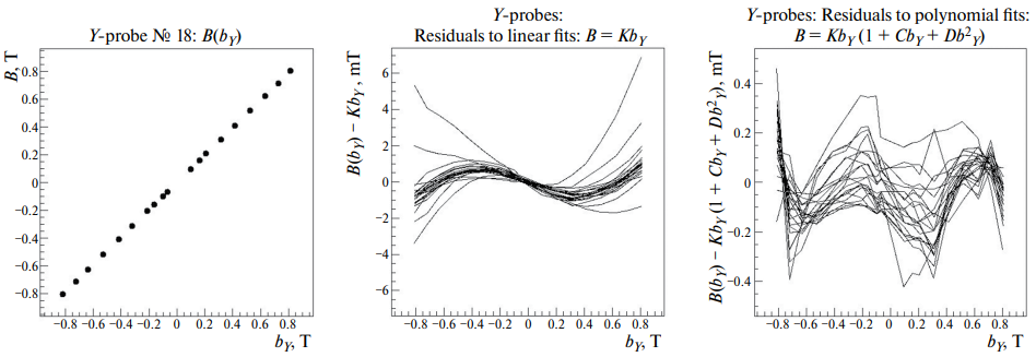 Измерения в магните были проведены на двадцати двух уровнях поля в диапазоне индукций от −0.8 до +0.8 Тл. К ним следует добавить еще измерение пьедесталов в нулевом поле вне магнита. На рис. 3 слева на примере одного из Y-датчиков показана зависимость истинной – по ЯМР-зондам – магнитной индукции B в точке нахождения этого датчика от значения bY, полученного в измерениях самим датчиком Холла в предположении его линейности с коэффициентом чувствительности из заводского паспорта.