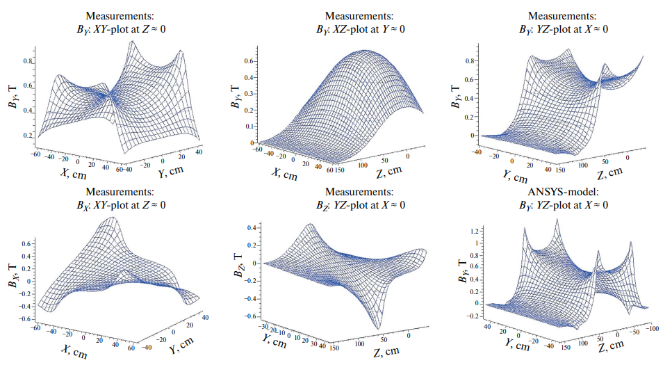 На следующем этапе была осуществлена подгонка расчетов и измерений методом наименьших квадратов с использованием двадцати четырех свободных параметров: 23 геометрических, таких как три шага измерительной решетки; три относительных сдвига координат; углы между осями и поправки на отклонения их от прямолинейности; углы ориентации средних по датчикам плоскостей измерения в расчетной системе и др. плюс абсолютная нормировка величины индукции. Были рассмотрены несколько вариантов подгонки: по всему измеренному объему – всего 101920 пар чисел для сравнения; по центральной полосе |Y| < 30 см, все точки которой удалены от полюсов не менее, чем на 20 см, – 70560 пар чисел; по центральной выборке с участием только двух поперечных компонент индукции BX и BY – 47040 пар чисел.
