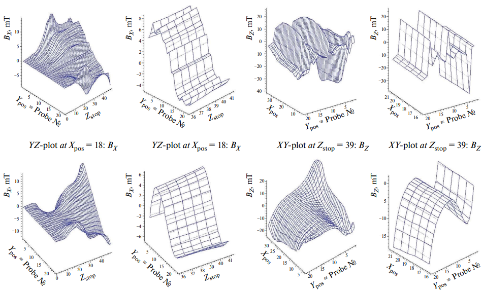 Таким образом, в каждой XZ-точке для каждого датчика Холла получается по одному уравнению для двух неизвестных – углов поворота α данного датчика в двух плоскостях относительно других датчиков. В результате осуществления такой процедуры более, чем в двух XZ-точках, с существенно различающимся поведением зависимостей BX(Ypos), BY(Ypos) и BZ(Ypos) получаются переопределенные системы из более, чем двух уравнений для каждой пары неизвестных, которые решаются, например, методом наименьших квадратов. В обсуждаемом здесь анализе сглаживание проводилось не менее, чем по четырем XZ-позициям. Правильный выбор набора XZ-точек для сглаживания является здесь абсолютно критичным для того, чтобы надежно отделить последствия неточного знания ориентации датчиков от последствий ошибок в чувствительности каналов измерений и в знании их пьедесталов.
