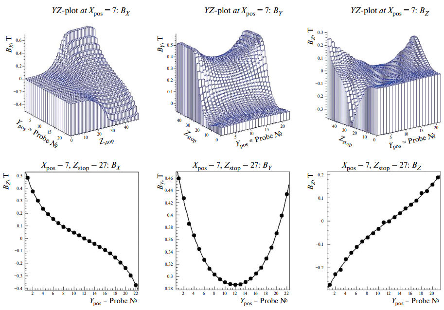 В центральной полосе вдали от полюсов среднеквадратичное отклонение (RMS) расчетов и измерений по двум поперечным компонентам дает оценку погрешности измерений δB ≈ ±0.95 мТл, т. е. примерно ±0.18% от индукции 0.54 Тл в центре магнита, а по всему измеренному объему δB ≈ ±1.9 мТл ≈ ±0.35%. Ухудшение RMS около полюсов связано с более высокой чувствительностью там к позиционированию датчиков, а также с ухудшением точности расчетов вблизи острых ребер и углов ферромагнитных полюсов. Включение в подгонку продольной компоненты BZ еще несколько ухудшает цифры по δB: примерно до ±1.1 и ±2.3 мТл соответственно. Здесь главным виновником является, по-видимому, повышенная чувствительность расчетной BZ к граничным условиям в области защитных экранов, особенно переднего, расположенного близко к центру магнита и частично перекрывающего его апертуру. Однако и требования к точности знания компоненты BZ сильно пониженные, поскольку ее вклад в отклонение вторичных заряженных частиц пропорционален квадрату угла вылета частицы относительно исходного пучка, что даже на границе аксептанса установки ±110 мрад дает ослабление требований к точности измерений BZ почти в 100 раз в сравнении с двумя другими компонентами.