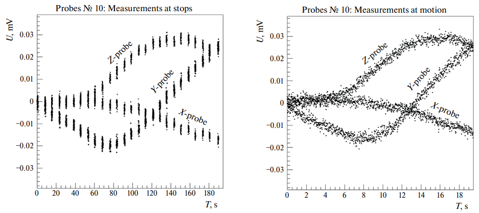 Можно было бы ожидать, что при измерениях в движении возрастут шумы из-за наводок от цепей управления шаговыми двигателями, работающими одновременно с измерениями поля. В проведенном эксперименте никакой значимой разницы в уровне шумов в режимах с остановками и в движении обнаружено не было. Для датчиков из группы № 10, показанных на рис. 10, среднеквадратичные флуктуации на частоте считывания fR = 50 Гц в обоих случаях практически одинаковы и укладываются в диапазон 1.3–1.5 мкВ. Такой уровень шумов близок, но несколько выше, чем 0.8–1.1 мкВ, предсказываемых частотной зависимостью стохастических шумов (см. раздел 2.2), пропорциональной , из наблюденных ранее 2.5–3.5 мкВ на частоте fR = 500 Гц. Причиной расхождения является присутствие в шумах когерентных низкочастотных компонент, не подчиняющихся зависимости, пропорциональной .