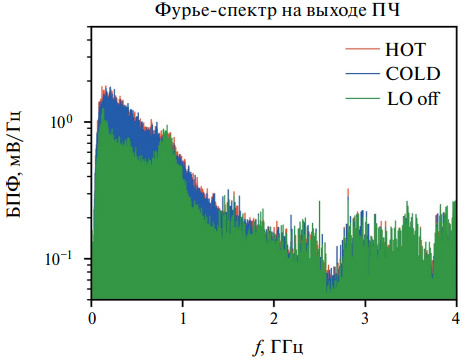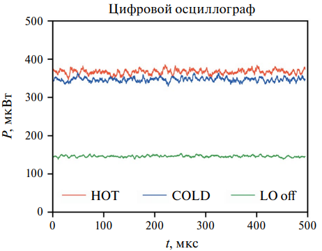 Рис. 4. Зависимость мощности сигналов на выходе ПЧ: HOT (красный) – теплая нагрузка, COLD (синий) – холодная нагрузка, LO off (зеленый) – теплая нагрузка при выключенном сигнале гетеродина, но включенных усилителях ПЧ (собственные шумы усилительного тракта ПЧ).