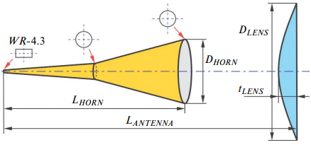 Из соображений миниатюризации общего изделия был выбран вариант антенны с линзой с фокусным расстоянием 30 мм с просветлением ее границы параллельной треугольной гофрировкой, где шаг гофрировки d = 0.71 мм и ее высота h = 0.43 мм были рассчитаны в соответствии с теорией [22].