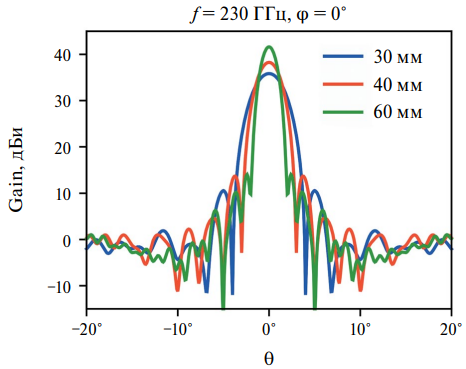 Было рассмотрено три варианта исполнения рупорно-линзовой антенной системы, эскиз которой представлен на рис. 7, с различными диаметрами линз (табл. 6). Размер питающего порта волновода взят стандартный – WR-4.3 (1.092 × 0.546 мм2), диэлектрическая проницаемость линзы задавалась формулой ε = 2.2 (Фторопласт Ф4). Диаграммы направленности в обеих плоскостях для центральной частоты f0 = 230 ГГц из рассматриваемого диапазона, рассчитанные в пакете электродинамического моделирования CST MWS, представлены на рис. 8, 9.