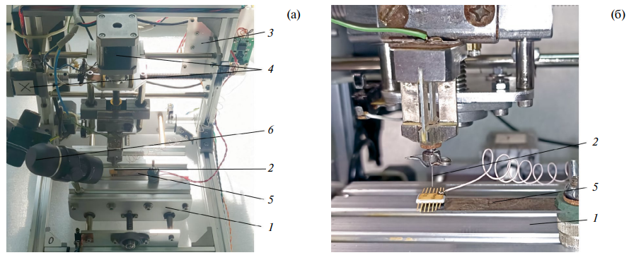 На рис. 1 представлен общий вид маркиратора. Он включает в себя трехосевую систему позиционирования гравировального станка CNC2418 [15] с линейными направляющими 1 для перемещения стола с образцом и иглы маркиратора 2. Блок управления 3 построен на базе платы Arduino UNO с использованием драйверов DRV8825, реализующих микрошаговый режим работы. Для перемещения используются шаговые двигатели 4 NEMA17 [16] (на рис. 1 один из трех двигателей не виден), характеристики которых представлены в табл. 1. Плавность перемещения образца при воздействии иглы, перемещаемой шаговым двигателем, обеспечивает консольная балка-демпфер 5. Образец закрепляется на конце балки на подложке из пенопропилена (двухсторонний “скотч”). Контроль подвода к образцу осуществляется посредством камеры 6 (Levenhuk DTX 90) с разрешением 3.2 Мп и оптическим увеличением ×300.
