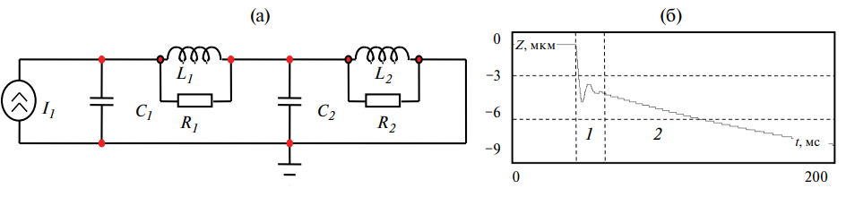 Типовой график перемещения поверхности образца при шаговом воздействии представлен на рис. 2б. На графике рис. 2б первоначальное резкое смещение образца (область 1) обусловлено деформацией балки, дальнейшее медленное смещение (область 2) обусловлено деформацией подложки крепления образца, имеющей низкую добротность. Чем ниже податливость балки по сравнению с податливостью подложки, тем меньше величина первоначального смещения по сравнению с последующим медленным смещением. Продолжительность воздействия составляет около 200 мс. Это значительно меньше, чем в нанотвердомерах, но значительно больше, чем при использовании только шагового двигателя без использования податливой подложки.