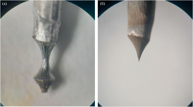 Рис. 3. Изображения (увеличение × 100) иглы маркиратора: а – результат после механической обработки заготовки, б – результат после электрохимического травления заготовки.