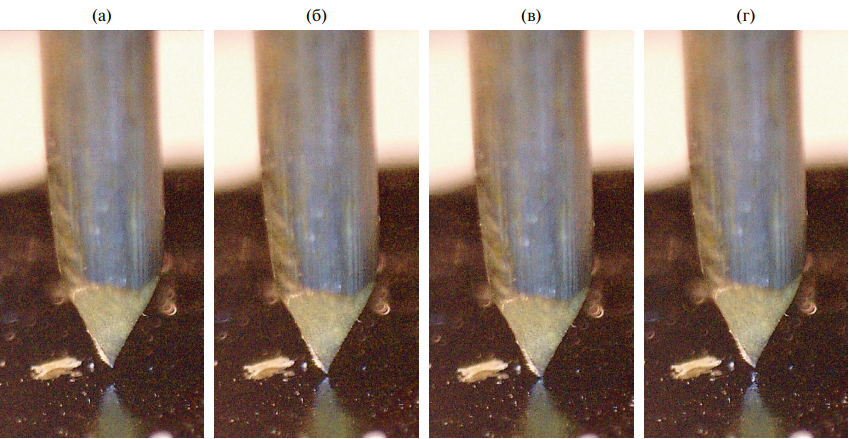 Для создания иглы маркиратора используется вольфрамовая проволока диаметром 1 мм. Вольфрам имеет высокую твердость (7.5 по Моосу), что позволяет маркировать достаточно широкий диапазон материалов, имеющих меньшую твердость (в частности, маркиратор успешно применялся для широко распространенных подложек из золота, слюды и пиролитического графита). Формирование острия иглы происходит в два этапа (рис. 3). Первоначально с помощью дисковой фрезы формируется профиль шейки (рис. 3а). Механическая обработка позволяет задать форму иглы с определенным углом заострения (30–60 градусов), а также ускорить процесс создания иглы. Затем выполняется электрохимическое травление заготовки [21], в результате которого происходит окончательное формирование иглы (рис. 3б). Нанесение маркировки осуществляется в два этапа. Первый этап – определение координат базовой точки отсчета, относительно которой осуществляются перемещения иглы при нанесении маркировки. Второй этап – формирование паттерна маркировки. Сначала с использованием цифровой камеры и шаговых двигателей выбираются XY-координаты базовой точки. При выборе положения ориентируются на целевой участок поверхности и макроориентиры на поверхности (выступы, углубления и т. п.). Игла при этом находится на достаточном расстоянии от образца, обеспечивающем сохранность ее кончика. Затем осуществляется подвод иглы к поверхности образца. Подвод выполняется в ручном режиме одиночными шаговыми перемещениями с контролем положения после каждого шага. Z-координата базовой точки определятся в момент касания поверхности. До момента касания между кончиком иглы и поверхностью образца наблюдается свободное пространство (рис. 4а, б). В момент касания (рис. 4в) данное пространство исчезает и может наблюдаться смещение образца. Наличие отпечатка проверяется после отвода иглы от образца (рис. 4г). Для уменьшения размера отпечатка определенная таким образом базовая Z-координата может быть скорректирована на величину 1–2 шагов шагового двигателя. Для токопроводящих образцов Z-координата базовой точки определяется в момент замыкания электрической цепи игла-образец.
