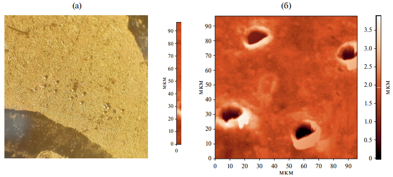 Рис. 5. Изображения микромаркировки на позолоченной подложке: а – изображение, полученное с помощью оптического микроскопа (увеличение ×400); б – изображение, полученное посредством зондового микроскопа.
