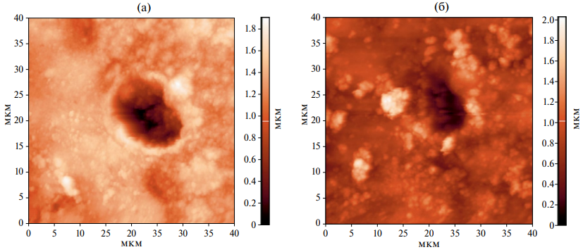 Результаты работы маркиратора на позолоченной подложке представлены на рис. 5. На рис. 5а приведено изображение, полученное с помощью оптического микроскопа, на рис. 5б – изображение, полученное с помощью зондового микроскопа Solver P47. Размеры отпечатков на рис. 5б сопоставимы по размерам с отпечатками, полученными с помощью нанотвердомера Nanotest 600 [12]. Глубина отпечатков при этом составила от 0.5 до 3 мкм, поэтому для их надежного распознавания рекомендуется, чтобы шероховатость окружающей поверхности Ra не превышала 0.1 мкм. Представленная на рис. 5 маркировка, кроме функции обозначения границ исследуемых областей, может выполнять защитную (вследствие уникальности отпечатка каждой иглы) и индикативную (изменение площади и глубины отпечатка по мере износа или загрязнения поверхности) функции. Например, на рис. 6 представлены два изображения, демонстрирующие снижение контрастности и площади изображения одного и того же отпечатка при загрязнении поверхности.