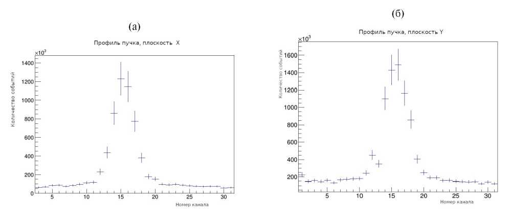 3.1.4. Профилометр. В сеансе 2022 испытания на пучке прошел прототип еще одного пучкового детектора — профилометра мишени. При проведении измерений с поляризованной мишенью очень важно, чтобы пучок проходил точно через само вещество мишени, а не через металл криостата. Для выделения пучка, проходящего через мишень, используется счетчик S3 на входе в криостат. Однако при длине криостата 2 м важно знать положение пучка именно на выходе из него. Задача осложняется тем, что в этом месте не может быть помещен детектор с большими габаритами типа пропорциональной камеры, а достаточно сильное магнитное поле от магнита поляризованной мишени не позволяет использовать детектор с регистрацией света с помощью ФЭУ. Поэтому для этих целей был разработан и изготовлен сцинтилляционный годоскоп с шагом 3 мм и кремниевыми фотоумножителями (SiPM) в качестве фотодетекторов (MicroFC-30035-SMT фирмы SensL). Свет из сцинтиллятора попадает в SiPM непосредственно, без оптических волокон. Усилители, расположенные в непосредственной близости от SiPM, обеспечивают высокую чувствительность и стабильность работы детектора. Рядом с усилителями расположены компараторы. Далее сигналы передаются в цифровом виде по стандарту LVDS. Для регистрации сигналов профилометра была разработана бестриггерная электроника, расположенная рядом с детектором, которая управляется по сети Ethernet и формирует отдельный поток в системе сбора данных. На рис. 2 представлены профили пучка π-мезонов по координатам X и Y в сеансе 2022, зарегистрированные профилометром в интегрирующем бестриггерном режиме. Следует отметить, что полученные профили, по сути, — одиночный счет фотодетекторов без совпадений с триггерным счетчиком. Как видим, шумовые характеристики SiPM вполне допускают эффективно использовать детектор в бестриггерном режиме.