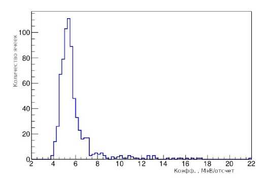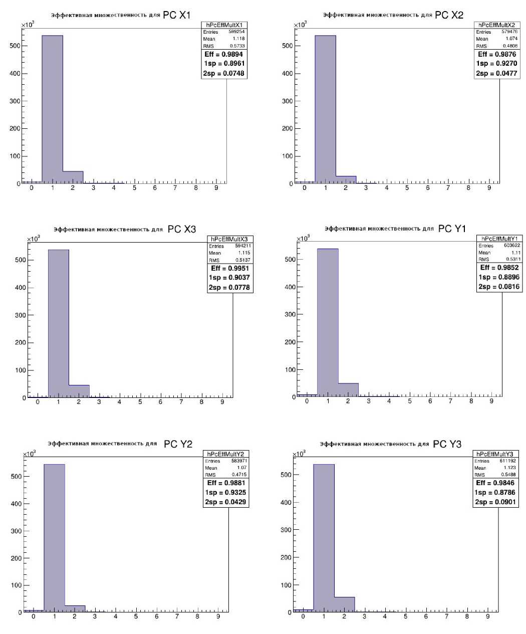 Рис. 3. Множественности срабатывания всех шести плоскостей пропорциональных камер, определяющие эффективность.