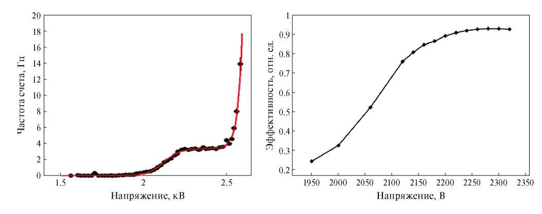 Рис. 5. Слева — усредненная счетная характеристика одной из камер, справа — зависимость эффективности одного из слоев камеры от напряжения.