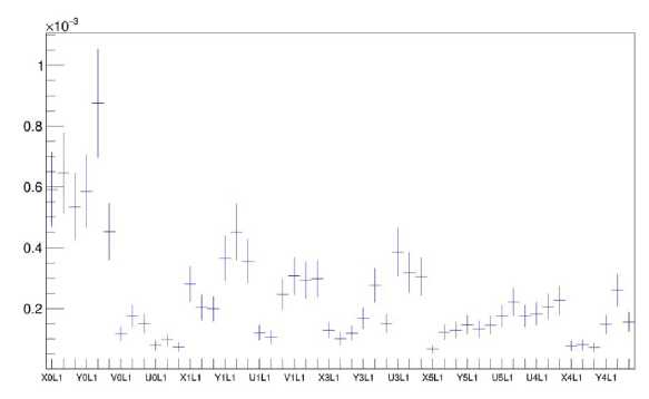 Рис. 6. Нестабильность эффективности трековой системы (RMS) за сутки по плоскостям. По оси X – идентификатор плоскости трековой системы в виде: станция (X0-U4) ), номер слоя(L1-3).