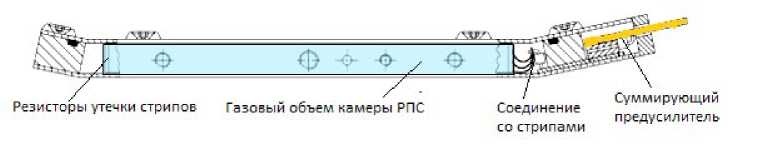 Рис. 6. Рисунок поперечного разреза камеры МРПС, расположение суммирующего предусилителя.