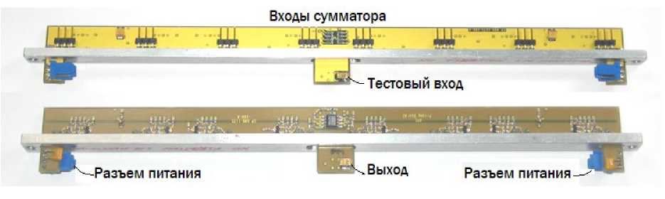 Каждый стрип камеры имеет вывод в виде лепестка (рис. 6) для соединения с каждым из входных разъемов (рис. 8), через который сигнал поступает на соответствующий вход сумматора. Общий провод камеры имеет электрическое соединение возле каждого стрипа как со входом сумматора, так и с задней крышкой камеры, изготовленной из алюминиевого сплава. Эта конструкция является экспериментально определенной конфигурацией сигнальных соединений, обеспечивающей наилучшее собственное временное разрешение смонтированной на камеры МРПС системы считывания около 50–60 пс (разброс по камерам) при подаче проверочного импульса через тестовый вход сумматора.