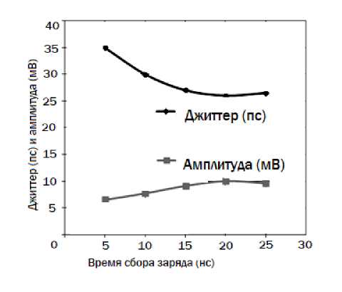 Рис. 13. График зависимости временного джиттера и амплитуды суммирующего усилителя от времени сбора заряда (Qвх = 480 фКл).