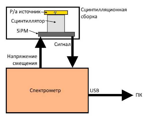 Рис. 2. Схема лабораторной установки: ПК – персональный компьютер, USB – кабель стандарта Universal Serial Bus, р/а источник – радиоактивный источник.