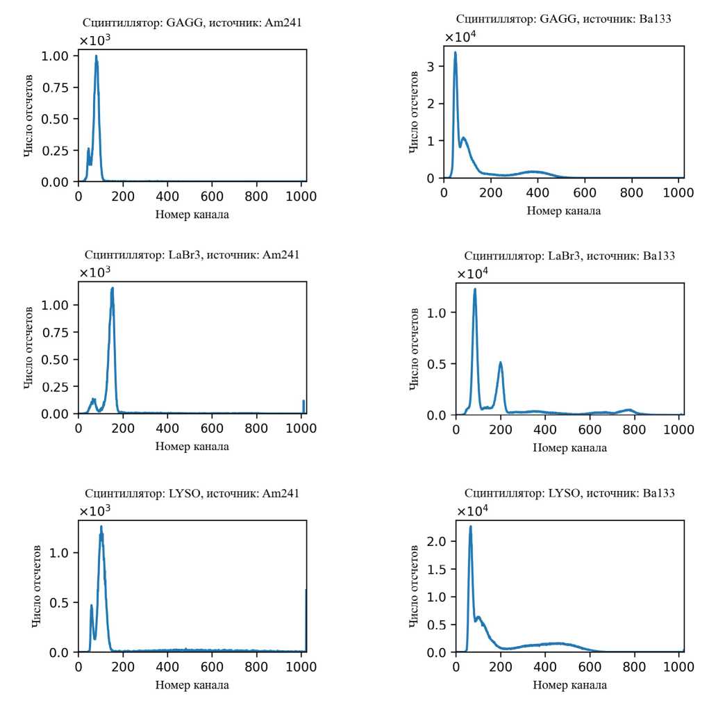 Для каждого сцинтиллятора (LYSO, LaBr3, GAGG) набираются спектры с использованием различных источников ионизирующего излучения (Ba-133 и Am-241, оба активностью около 10 кБк). При этом время набора выбирается таким образом, чтобы количество событий, набранных в каналах, соответствующих максимумам пиков полного поглощения гамма-квантов, соответствовало относительной статистической ошибке не более 3%. Спектры сохраняются на жесткий диск компьютера для дальнейшей обработки. Примеры спектров приведены на рис. 3.