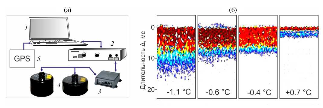 Рис. 1. а – Блок-схема портативного комплекса: 1 — управляющий компьютер, 2 — основной блок, 3 — блок согласования, 4 — электроакустические преобразователи, 5 — блок системы глобального позиционирования (GPS, ГЛОНАСС и др.); б –фрагменты эхограмм на частоте 50 кГц при различных температурах донных осадков.