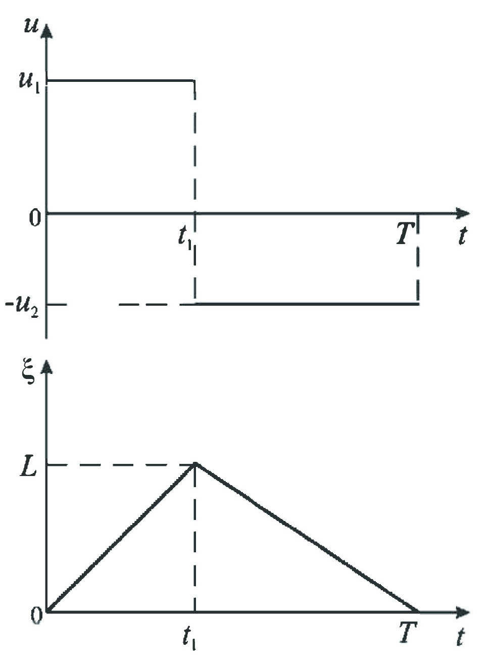 Здесь − положительные постоянные, а − длительности интервалов времени движения массы m вперед и назад соответственно. В начале и в конце периода (при ) внутренняя масса находится на левом конце полости (при этом ), а в момент − на ее правом конце, при где − длина полости. Зависимости и изображены на рис. 2.