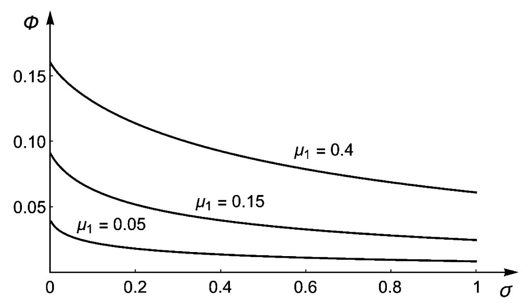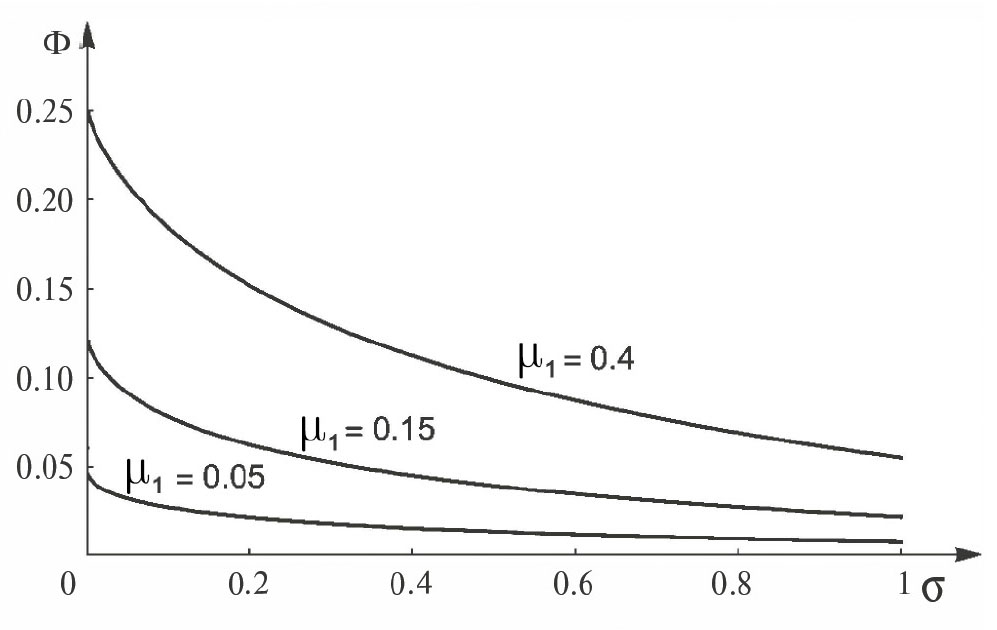Рис. 6. Зависимость Φ от параметра σ при μ1=0,4.