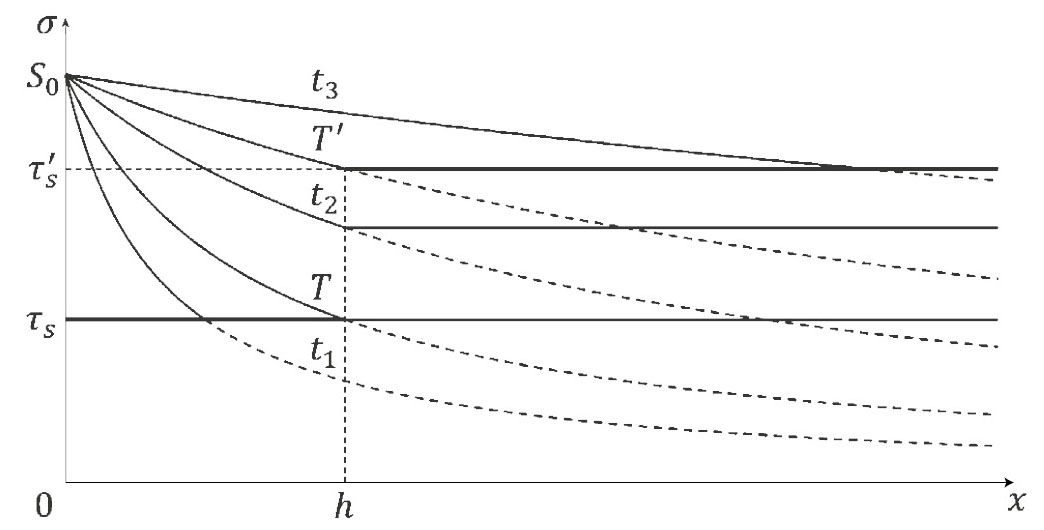 2°. На втором интервале толщина области сдвига не меняется со временем и равна . Непрерывный по профиль касательного напряжения следующий: