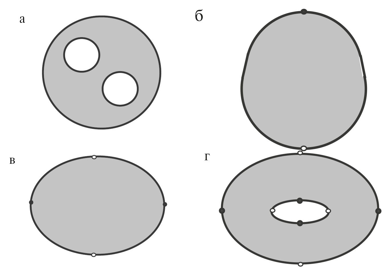 Рис. 3. Круглая пластина с вырезанными кругами (а), яйцевидная область (б), эллипс (в), эллиптическое кольцо (г). Точки глобальных и локальных максимумов и минимумов кривизны указаны метками ● и ○ соответственно.