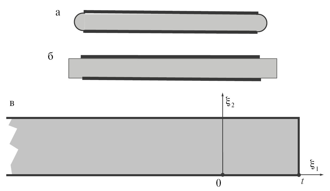 Рис. 5. Пластины с закругленной поверхностью (а), выступающая за кромки штампов, обозначенных полужирными линиями (б), полуполоса, служащая для описания пограничного слоя (в).