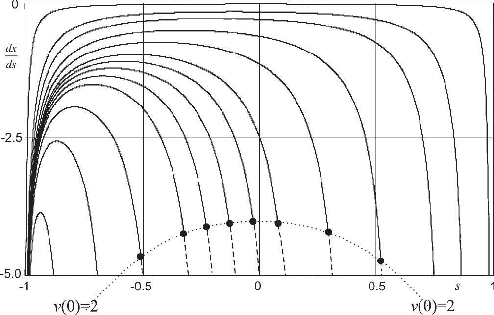 Очевидно, что каждая траектория имеет две асимптоты, одна – “в прошлом”, слева – выше траекторий, вторая – в будущем, вертикальная справа. В [3] основное внимание уделялось именно обоснованию существования этой правой асимптоты. Самая правая из них имеет координату , и ей соответствует . Все левые асимптоты – прямые, по которым двигалась бы материальная точка при отсутствии тяжести. Они пересекают ось y, на этой оси полужирными точками выделен тот ее участок, который пересекается асимптотами построенных траекторий.