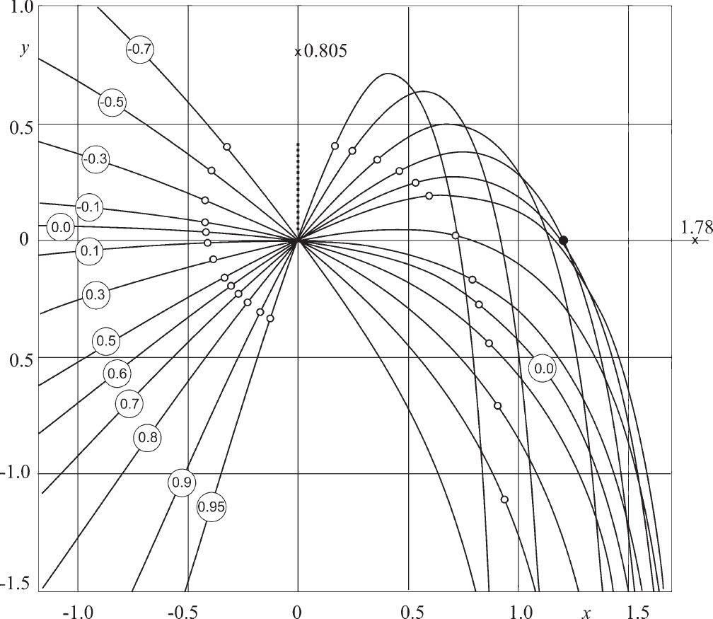 Наконец, построим “веер” траекторий движения точки с начальной скоростью и с различными начальными углами бросания (рис. 5). На левых участках траекторий в кружочках указаны соответствующие значения параметра . Кроме того, на траекториях маленькими кружками отмечены точки, в которых скорость принимает значение 3 (слева) и 1 (справа). Если мы захотим построить такой же веер, но для другой начальной скорости, надо просто сдвинуть каждую траекторию так, чтобы все нужные кружочки собрались в начале координат! Для перевода нормированных значений x и y в натуральные X, Y необходимо использовать коэффициент k.