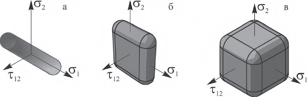 Рис. 1. Предельные поверхности в виде: а – закругленного цилиндра для однонаправленного композита, б – “диванной подушки” (ottoman cushion) для ортогонально армированного пластика; в — трехмерного косоугольного параллелепипеда для армирования в трех и более направлениях.