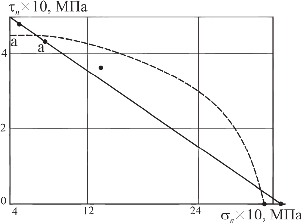 На рис. 3 проиллюстрирован метод определения параметров линейных критериев прочности: экспериментальные данные для ортогонально армированного углепластика нанесены в координатах , .
