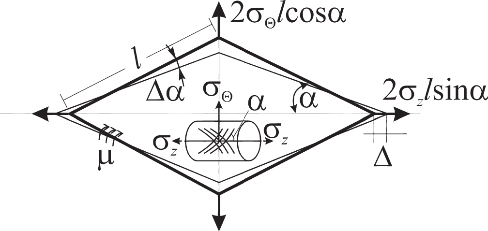 Наиболее интересно применение данной модели для двухосного растяжения. Окружная сила от действия окружных напряжений стремится, напротив, увеличить , и приведенный выше анализ остается в силе с точностью до замены на . Как видно на рис. 4, осевые и окружные напряжения пытаются исказить ромб в разных направлениях, что дает (рис. 5) значительный упрочняющий эффект и приводит к следующему условию разрушения: