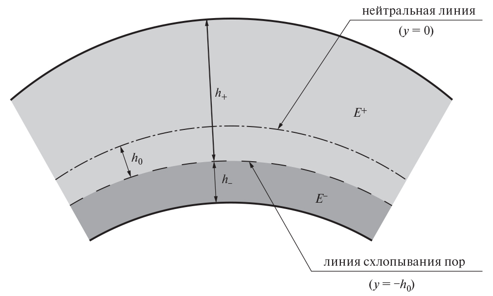 При цилиндрическом изгибе деформация определяется по формуле , где R – радиус кривизны, y – координата точки поперечного сечения балки, отсчитываемая от нейтральной линии, продольная деформация которой равна нулю. Всюду ниже через и обозначены толщины сечений (слоев) с раскрытыми и сжатыми порами, – толщина балки, – расстояние от нейтральной линии до линии схлопывания пор (рис. 3).