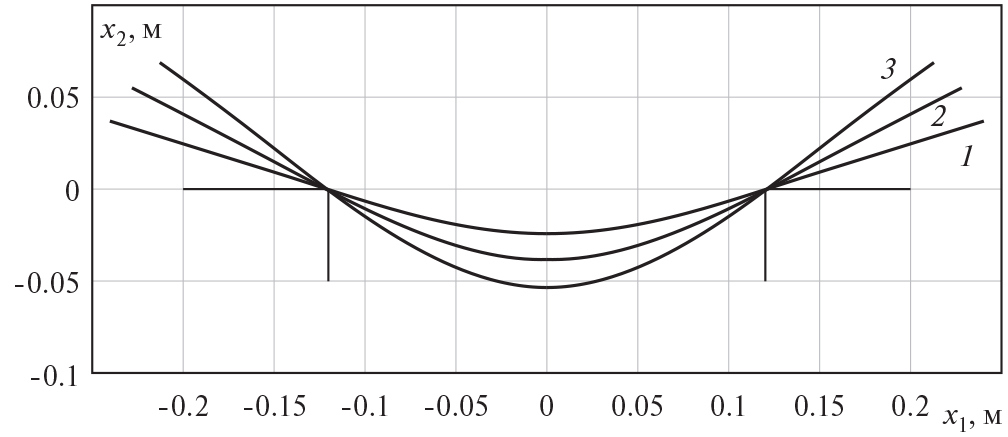 Рис. 6. Расчетные прогибы балки: 1 – алюминий; 2 – пористый алюминий; 3 – пористый алюминий, без учета уплотнения.