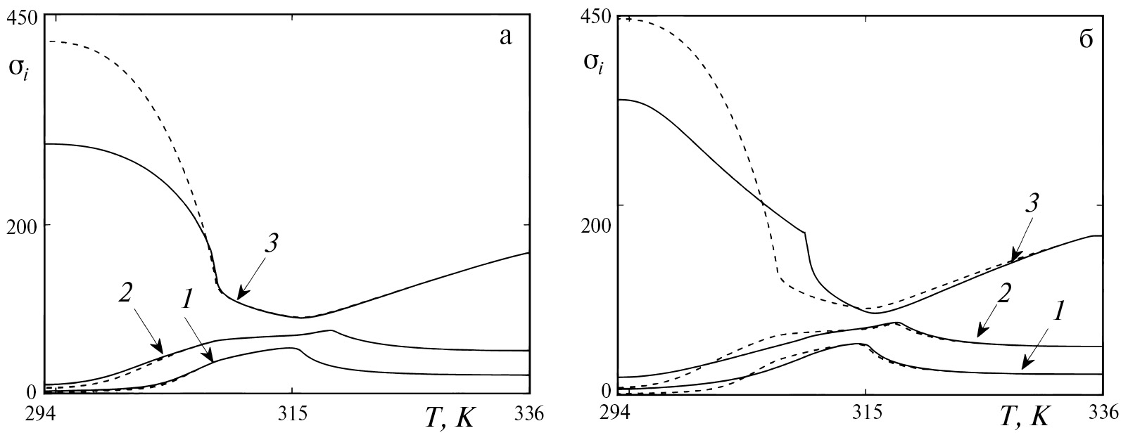 На рис. 3–5 линии 1 построены для точек, находящихся на внешней поверхности сферы, линии 2 – для , линии 3 – для точек внутренней поверхности. На рис. 3 приведены графики зависимости интенсивности напряжений от температуры, иллюстрирующие процедуру принятия решения о включении или выключении структурного механизма деформирования. Наибольшая интенсивность напряжений в каждый момент времени как при внутреннем, так и при внешнем давлении наблюдается в точках внутренней границы тела. Однако ни при начальном нагружении в аустенитном состоянии до значения интенсивности напряжения (правые вертикальные отрезки на рис. 3), ни в последующем процессе падения и последующем возрастании этой величины до значения структурный механизм деформации вблизи внутренней поверхности (кривые 3) не работает из-за нарушения условий (3.7). Структурный механизм включается в той точке процесса прямого превращения, в которой возрастающая интенсивность напряжений достигает значения (точка излома на линии 3 рис. 3, б). В то же время для точек внешней поверхности и промежуточной (линии 1 и 2) интенсивность напряжений возрастает с самого начала прямого превращения и до точек максимума напряжений, после этого монотонно убывает. Поэтому на участке монотонного роста от начала фазового перехода и до точки максимума на линиях 1 и 2 рис. 3 структурный переход имеет место, а после точки максимума и до завершения фазового перехода отсутствует. Наблюдаемая разница между сплошными и пунктирными линиями 1 и 2 после точек максимума связана с тем обстоятельством, что структурный переход происходит в точках с большими значениями радиальной координаты (линии 3).