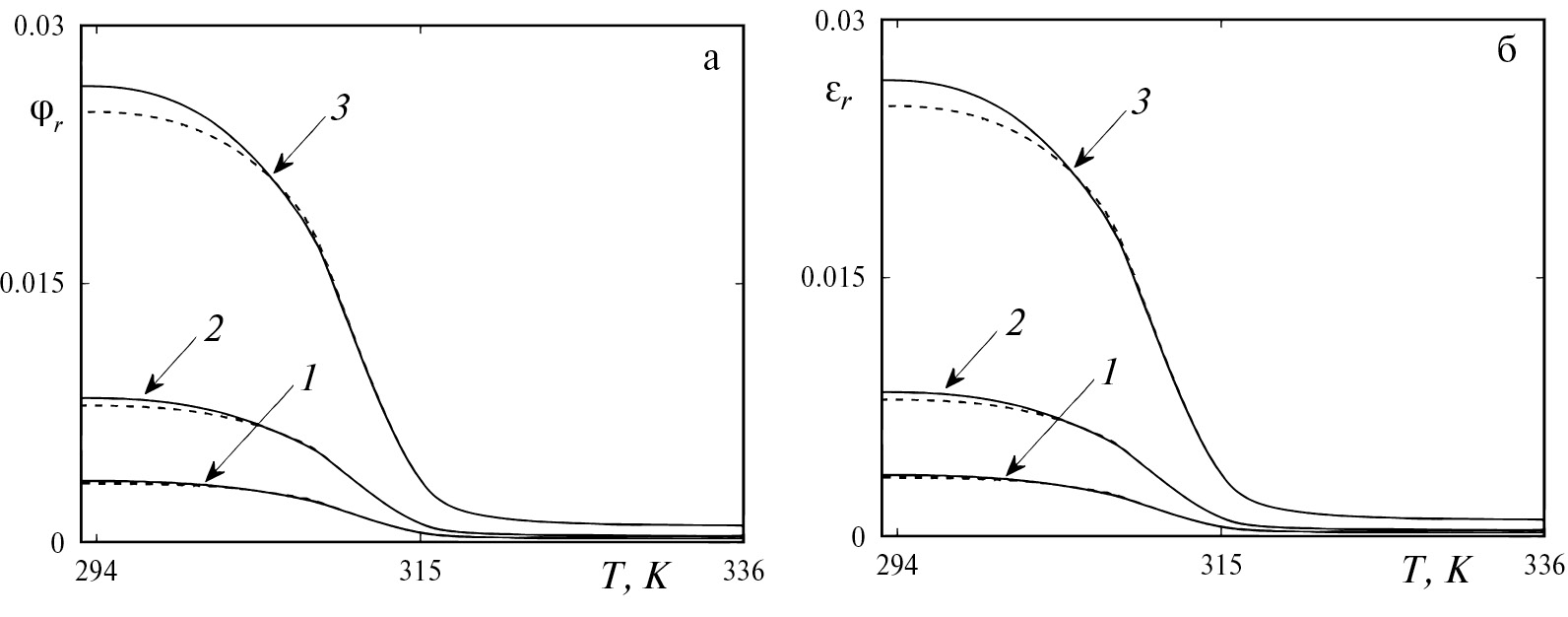 Формула для производной dq/dt получается с учетом зависимостей (6.3) и (6.5), а также определяющих соотношений (3.4) и (3.6). После определения зависимости от времени интенсивности фазово-структурной деформации по формуле (6.10), компоненты фазово-структурной деформации вычислялись по формуле (6.4), упругие деформации определялись по закону Гука с учетом переменности модулей при фазовом переходе по формулам (3.1). На рис. 1 сплошными линиями представлены графики полученных таким образом зависимостей деформаций и от температуры для случая МПа, МПа, , , что соответствует значению параметра вида напряженного состояния . Там же штриховыми линиями изображены результаты полученного с помощью разработанной процедуры численного решения задачи о деформировании цилиндра, находящегося в состоянии равнодвухосного сжатия по граням, перпендикулярным осям x и y в отсутствии внешней нагрузки по граням, перпендикулярным оси z. Как видно, получено неплохое совпадение результатов численного решения и решения в квадратурах.
