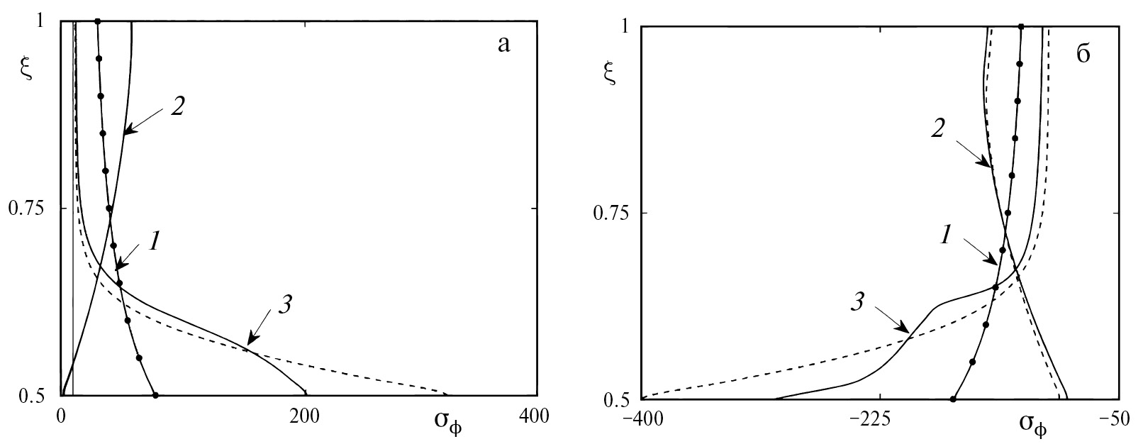 На рис. 6, а, б и 7, а, б приведены эпюры радиальных и кольцевых напряжений соответственно. Здесь – безразмерная радиальная координата. Кривые 1 соответствуют упругому решению задачи (материал оболочки находится в аустенитном фазовом состоянии), кривые 2 – этапу охлаждения в тот момент, когда фронт начала фазового перехода достиг внешней поверхности муфты, кривые 3 – этапу охлаждения, когда все сечение оболочки полностью перешло в мартенситную фазу и прямое превращение завершено, точки – аналитическому решению для упругого поведения (нанесены для проверки численного решения).