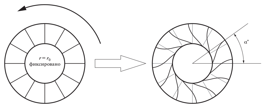 На рис. 3 приведено искривление материальных волокон, изначально направленных радиально, при углах поворота внешней поверхности (все значения в радианах). Угол радиан соответствует полному переходу образца в пластическое состояние. Первые пять значений угла соответствуют относительной протяженности пластической области .