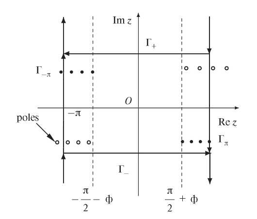 f имеет полюсы в z=±z0, z0=π2+Φ+iτ0, τ0=arcch(ω2/gκ), ch(τ0)=γ/κ>1, т. е. f(z)β/2zz0 голоморфны в проколотой окрестности точек z=±z0 и не имеет других особенностей на границе полосы. Постоянная β будет выбрана далее.