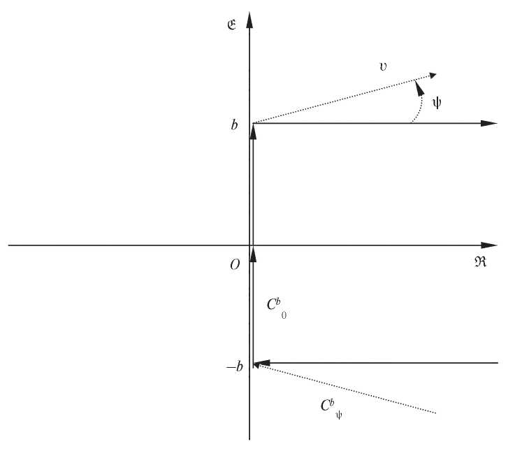Стоит прокомментировать сходимость при ν=0 в смысле главного значения в (4.1). Интеграл в (4.1) может быть представлен суммой интегралов по отрезку [ib,ib] мнимой оси и по C0b\[ib,ib] (см. рис. 3). Воспользуемся симметрией отрезка интегрирования [ib,ib] относительно начала координат и преобразуем интеграл по нему с целью его регуляризации при ν=0,